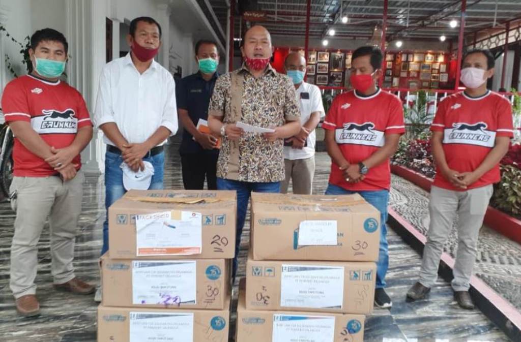 TAPANULI UTARA - PT Penerbit Buku Erlangga kembali menyalurkan Alat Pelindung Diri (APD) berupa Face Shield ataupun pelindung wajah untuk tenaga medis Taput. Bantuan dikirimkan Dirut PT Penerbit Erlangga Raja Daut Manahara Hutauruk disampaikan perwakilannya Henri Hutauruk, Benton Mahulae, Franto Lumban Gaol, Gomgom Sianturi kepada Bupati Taput Nikson Nababan.