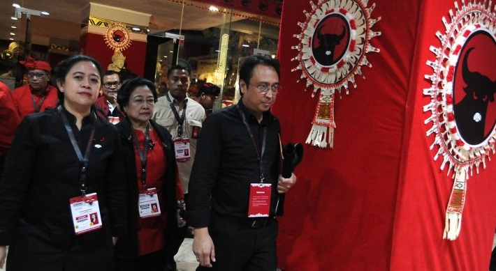 Ketua Umum PDI Perjuangan Megawati Soekarnoputri (tengah) didampingi politisi PDI Perjuangan Puan Maharani (kiri) dan Prananda Prabowo (kanan) meninggalkan ruangan usai konferensi pers di Sanur, Denpasar, Bali. PALAPA POS/Istimewa