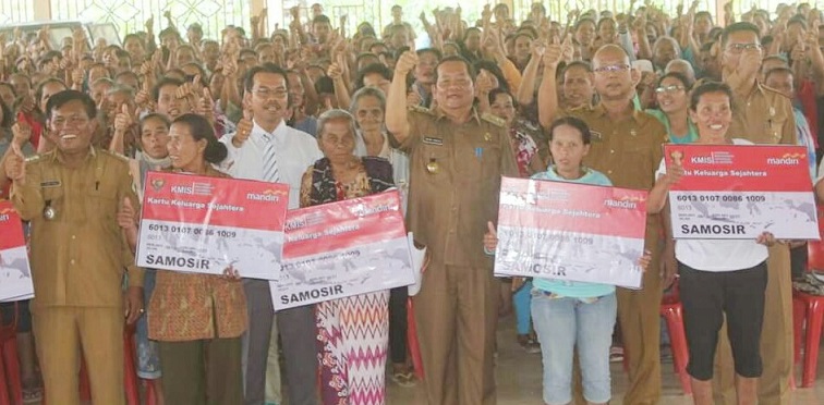 SAMOSIR - Bupati Samosir Rapidin Simbolon membagikan 662 Kartu Keluarga Sejahtera (KKS) kepada masyarakat dari 17 Desa dimana penerima manfaat bantuan pangan non tunai (BPNT) itu dilaksanakan di Aula HKBP Mogang, Kecamatan Palipi, Kabupaten Samosir, Senin (27/5/2019).