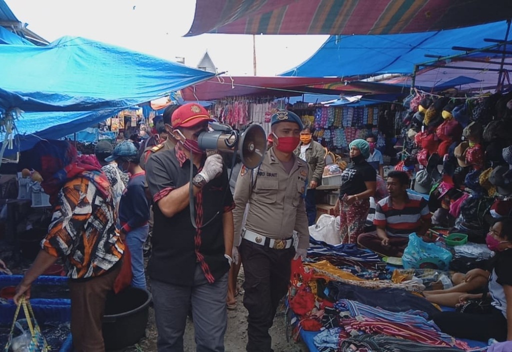 Kepala Satpol PP Taput Rudi Sitorus bersama tim Gugus Tugas Covid-19 saat turun razia masker di Pasar Tradisional Siborongborong. PALAPAPOS/Alpon Situmorang