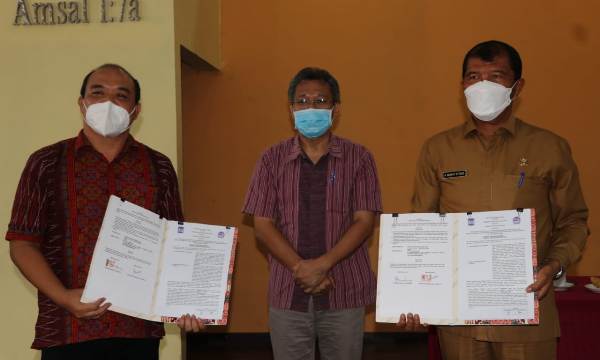 Perjanjian Kerjasama Pemkab Toba dan IT Del tentang Rusunawa II IT Del sebagai tempat isolasi terpadu pasien Covid-19, Selasa (24/8/2021). PALAPA POS/ Desi