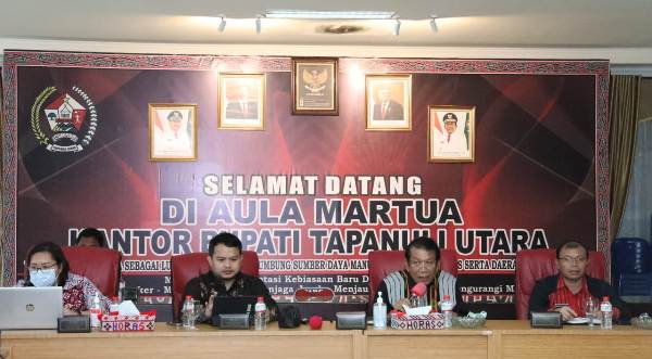 Satgas Korsupgah Korwil I KPK RI Sumut dan Wabup Sarlandy Hutabarat saat rapat kordinasi di aula Martua Kantor Bupati, Tarutung, Kamis (23/6/2022). PALAPA POS/Alpon Situmorang