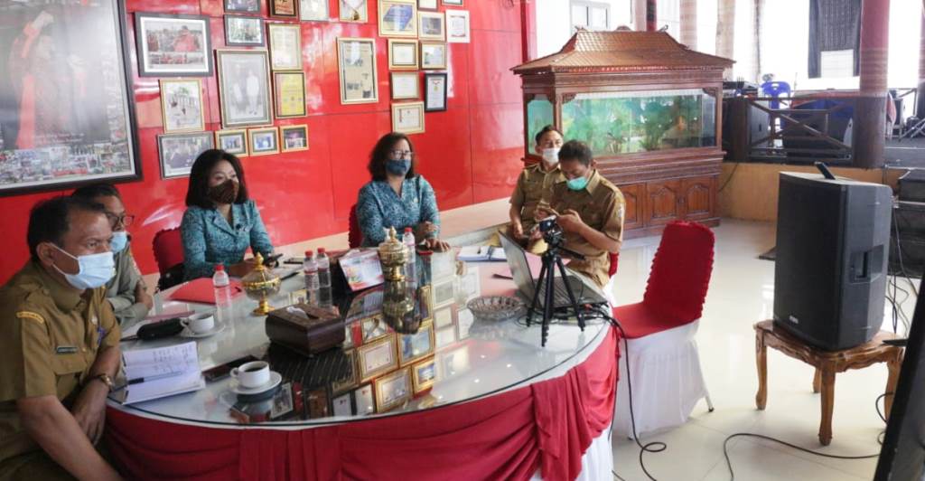 Ketua TP PKK Taput Satika Simamora didampingi pengurus PKK dan pimpinan OPD Pemkab Taput saat mengikuti webinar dengan Mendagri Tito Karnavian dan Ketua TP PKK Nasional. PALAPAPOS/Hengki Tobing