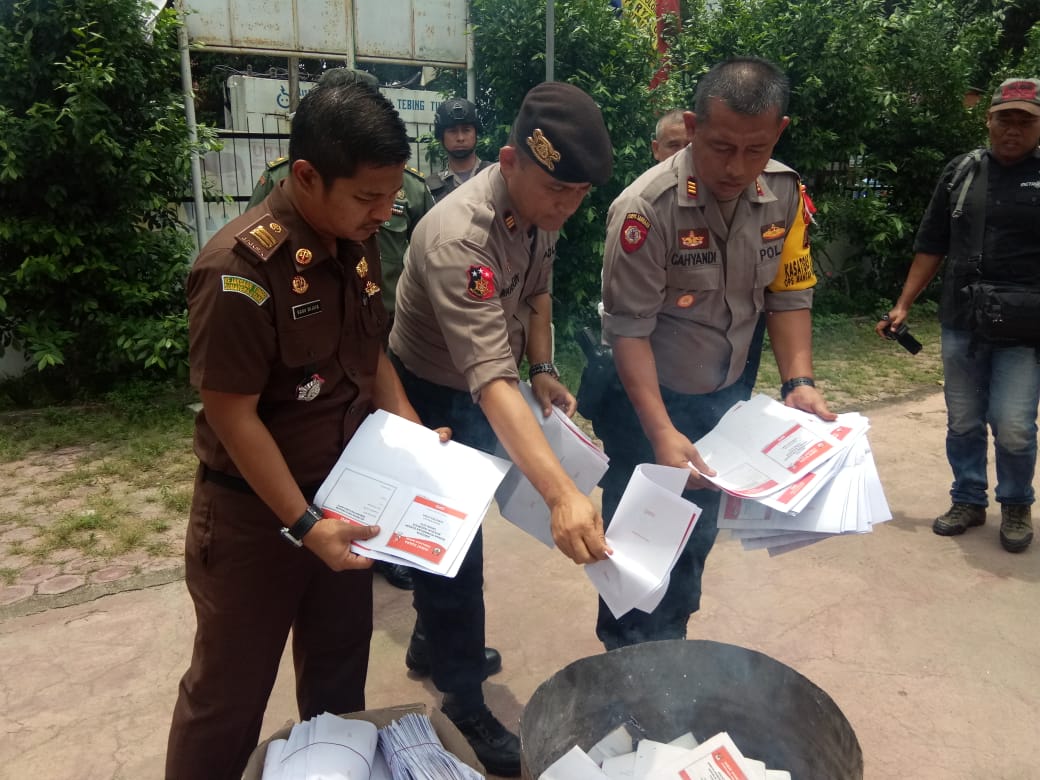 TEBINGTINGGI - Komisi Pemilihan Umum (KPU) Kota Tebing Tinggi melaksanakan pemusnahan kertas surat suara yang rusak di halaman kantor sekretariat KPU Jalan Rumah Sakit Umum Kota Tebing Tinggi, sekaligus melepas logistik pemilu ke Lima Kecamatan yang ada di Kota Tebing Tinggi, Selasa (16/4/2019).