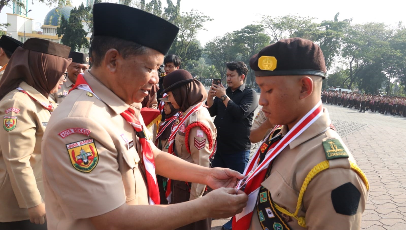 Hadir, Ketua Kwarcab Kota Bekasi, Ade Puspitasari, para pejabat perangkat daerah dan para peserta upacara yang dihadiri sekitar 2500 dari masing masing Kwartir Cabang Kecamatan se Kota Bekasi.