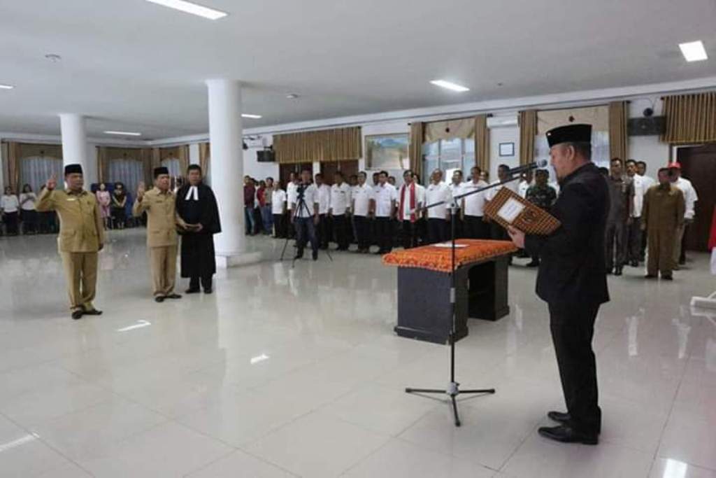 Bupati Taput Nikson Nababan saat melantik Indra Simaremare sebagai Sekda Taput dari jabatan sebelumnya sebagai Kepala Bappeda. Karena sudah kosong, pengisi jabatan Kepala Bappeda itu pun akan diseleksi Pemkab Taput. PALAPA POS/Hengki Tobing