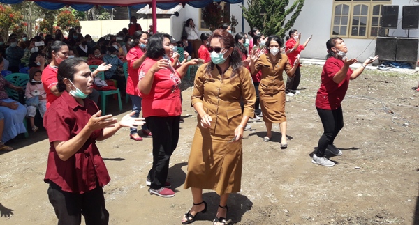 PUS Kecamatan Parmonangan saat menari dan menyanyikan Jingle IVA test bersama Kapus Aek Raja Bungani Sirait dan Parmonangan dr Donda Purba. Selasa (26/10/2021). PALAPA POS/ Alpon Situmorang