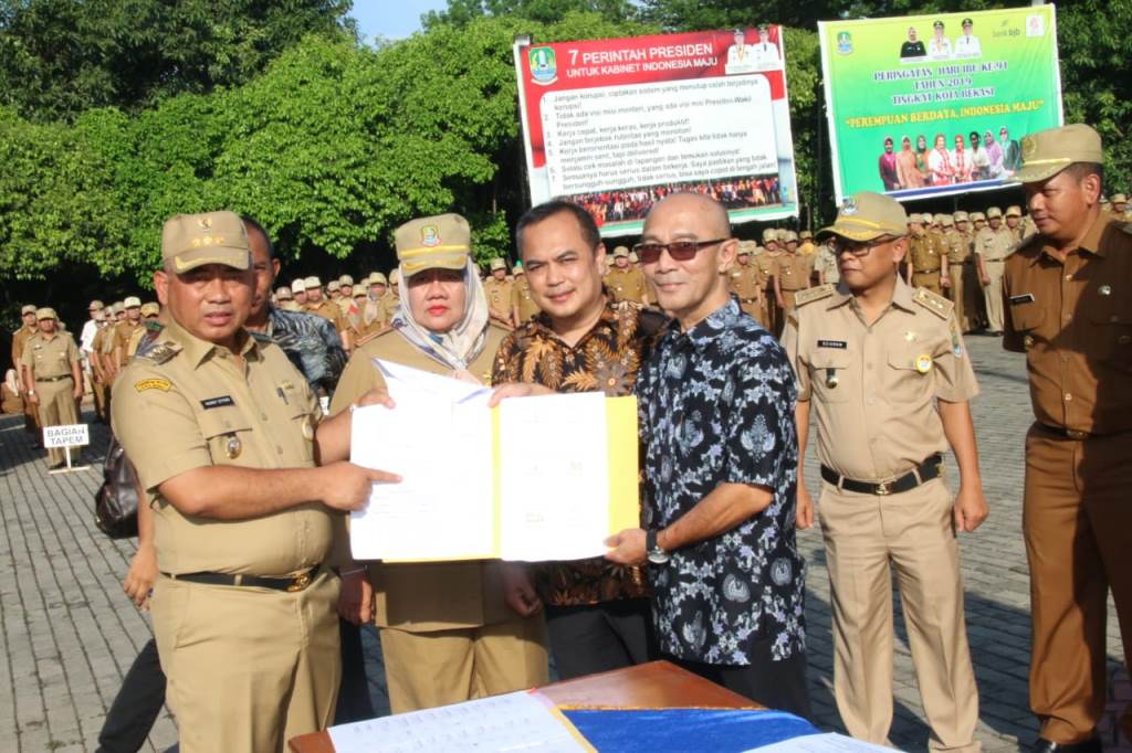 Wali Kota Bekasi Rahmat Effendi saat penandatanganan penyerahan sepihak delapan PSU (Pra Sarana dan Utilitas) Kawasan Perumahan, Perdagangan, dan Industri di Plaza Pemerintah Kota Bekasi, Senin (30/12/2019). PALAPAPOS/Nuralam