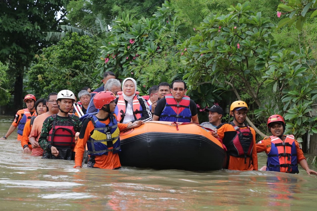 Menteri Ketenagakerjaan Ida Fauziyah ikut serta membantu proses evakuasi 20 peserta pelatihan yang terjebak banjir setinggi hingga 2 meter di Balai Besar Pengembangan Latihan Kerja (BBPLK) Cevest Bekasi di Jalan Guntur Raya, Kelurahan Kayuringin Jaya, Kecamatan Bekasi Selatan, Kota Bekasi, Jawa Barat. PALAPAPOS/Nuralam