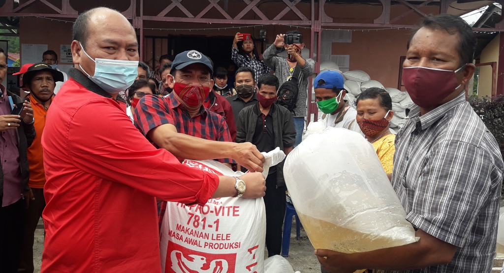Bupati Taput saat menyerahkan bibit ikan Mas dan Nila serta pakan secara simbolis kepada petani guna mendukung ketahanan pangan. PALAPAPOS/Alpon Situmorang