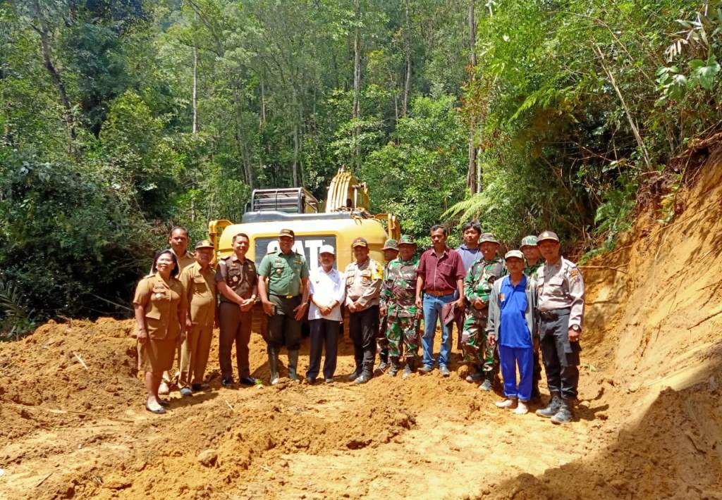 Wakil Bupati Tibasa Hulman Sitorus bersama Kapolres Tobasa, Dandim dan lainnya dengan latar sebuah alat berat dalam rangkaian Pembukaan TMMD Imbangan TA 2019 dengan sasaran pembukaan jalan Desa Sibide tembus ke Desa Meranti Utara di Kabupaten Tobasa. PALAPAPOS/Humas Polres Tobasa