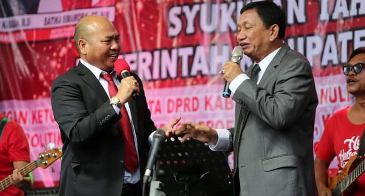 Bupati Taput Nikson Nababan saat duet dengan Mantan Bupati Torang Lumbantobing dalam agenda sukuran tahun baru 2023 di rumah dinas Bupati, Jumat (6/1/2022). PALAPA POS/ Alpon Situmorang