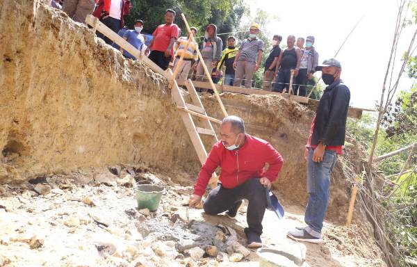 Bupati Taput Nikson Nababan saat meletakkan batu pertama menandai pembangunan jembatan yang akan dinamai Trisakti Bung Karno di Dusun Simarsalaon Desa Pertengahan, Sabtu (4/9/2021). PALAPA POS/ Alpon Situmorang
