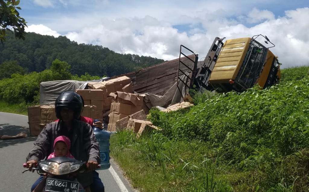 Truk sarat muatan ini terjungkal kebahu jalan, sementara muatan bahan baku kertas yang diusung dari PT TPL itu sebagian berserak dibahu jalan dan telah dikumpulkan dipinggir jalan menunggu bantuan. Tampak ban dan gardang truknya menengadah keatas. Meski tidak ada korban jiwa, namun keadaan seperti ini kerap menakutkan pengguna jalan umum ini.