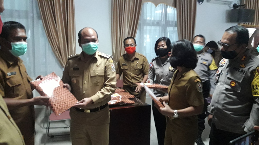 Bupati Taput Nikson Nababan bergantian bersama Forkopimda secara simbolis saat menyerahkan Voucher Sembako senilai Rp 200 ribu kepada Lurah untuk disalurkan ke warga terdampak Covid-19. PALAPAPOS/Alpon Situmorang