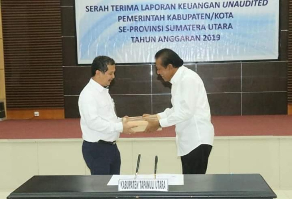 TAPANULI UTARA - Wakil Bupati Tapanuli Utara Sarlandy Hutabarat menyampaikan Laporan Keuangan Pemerintah Daerah Kabupaten Tapanuli Utara Tahun Anggaran 2019 ke Badan Pemeriksa Keuangan (BPK) RI Perwakilan Provinsi Sumatera Utara yang diterima Kepala Badan Pemeriksa keuangan perwakilan Sumut Eydu Oktain Panjaitan, di Aula Kantor BPK RI Perwakilan Sumut, Rabu (26/2/2020).