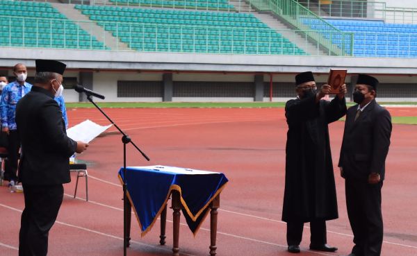 Proses pelantikan Direktur Bidang Usaha PDAM Tirta Patriot Ali Imam Fariyadi oleh Wali Kota Bekasi, Rahmat Effendi di Stadion Patriot Chandrabhaga, Kota Bekasi, Rabu (29/12/2021). PALAPA POS/ Yudha
